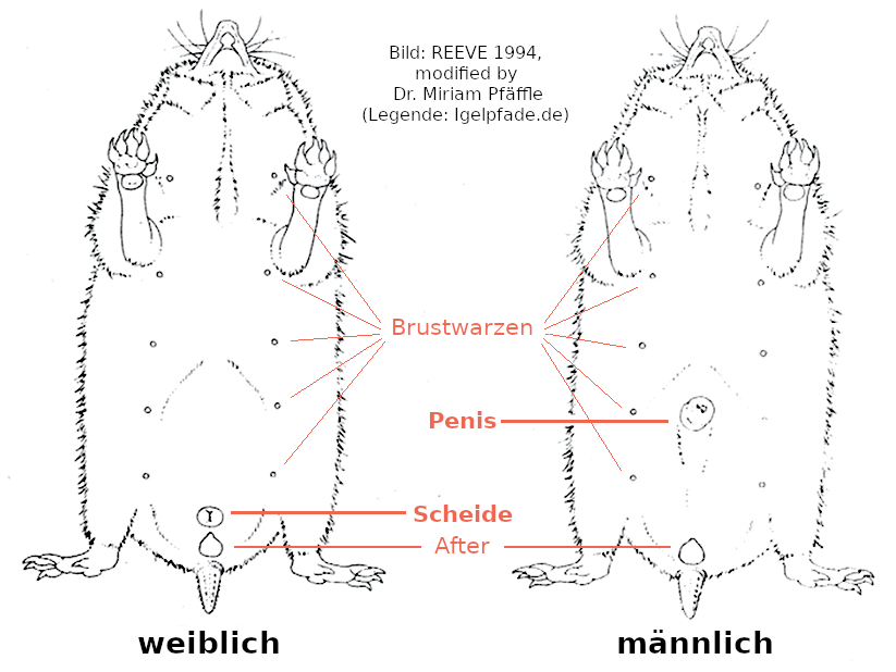 Ein ausgewachsener Igel ist zwischen 24-28cm lang und wiegt zwischen 800 und 1500 Gramm, manchmal auch etwas mehr, wobei Männchen im Allgemeinen schwerer sind als Weibchen. Das Geschlecht lässt sich von Außen lediglich an den Geschlechtsorganen unterscheiden. Beim Männchen befindet sich die Penisöffnung am Bauch etwa auf der Höhe, wo man den Bauchnabel vermuten würde. Die Vulva der Weibchen liegt unmittelbar vor dem After.